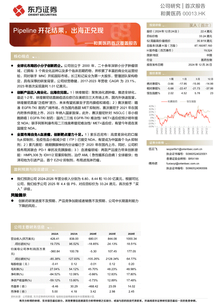 和黄医药首次报告—— Pipeline开花结果,出海正兑现22 图20:可比公司估值表数据来源:wind,东方证券研究所风险提示创新药研发进度不及预期的风险。