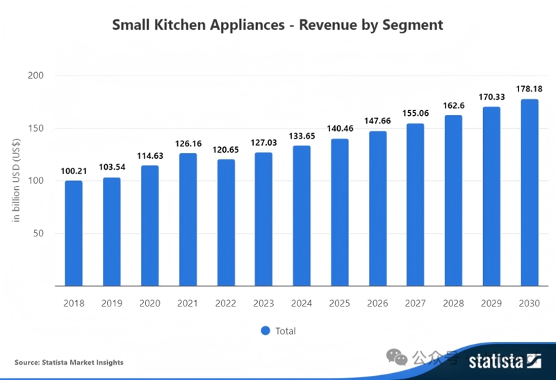 综合来看,全球厨房小家电市场已形成上千亿美元规模,保持稳健增长状态。根据Statista数据,2024年全球厨房小家电市场规模为1336.50亿美元,2025年将增至1404.60亿美元,2030年达1781.80亿美元,2025-2030年的复合年均增长率为4.87%。另据Global Market Insights数据显示,2023年全球厨房小家电市场规模为1297亿美元,预计2032年增至2054亿美元,期间复合年均增长率为4.70%。Future Market Insights数据显示,2023年全球厨房小家电市场规模为1058.40亿美元,预计2033年增至1450亿美元,预测期内的复合年均增长率为3.20%。
